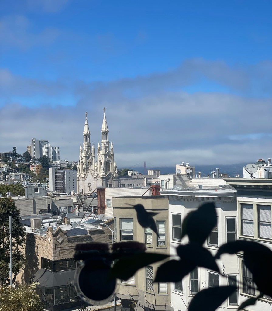 In my San Francisco apartment, a couple of hummingbird feeders hang from the windows, overlooking church steeples and the Golden Gate Bridge. Ginseng plants, a Christmas cactus, and monsteras line the window, adding a touch of green, while the feeders pop with their signature red with golden bullseye centers. Hummingbirds visit the Ye Olde Powell Watering Hole in San Francisco multiple times per day.